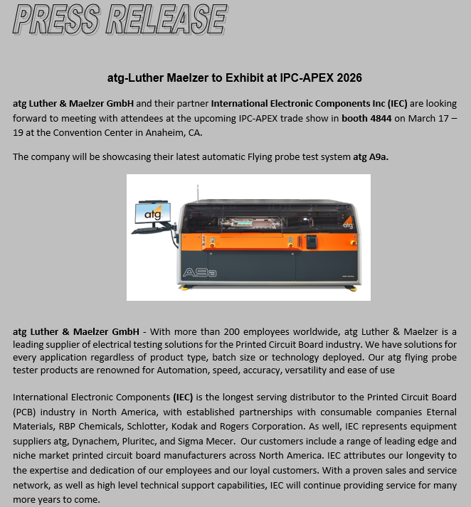 IEC is the printed circuit board industry’s longest serving distributor. With over fifty-one years in the PCB industry and extensive American and Canadian coverage, IEC prides itself on creating lasting partnerships to provide leading edge equipment, chemistry, copper clad laminates and imaging products. This expansion adds to legacy IEC ATG distribution territories in Northern California, the Pacific North West, Mountain States and Canada.